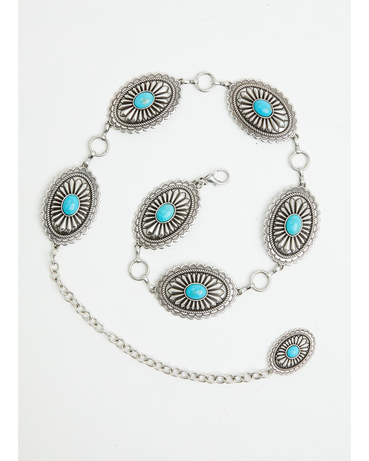 - Scalloped oval conchos with etched detailing and center turquoise stone inlay
