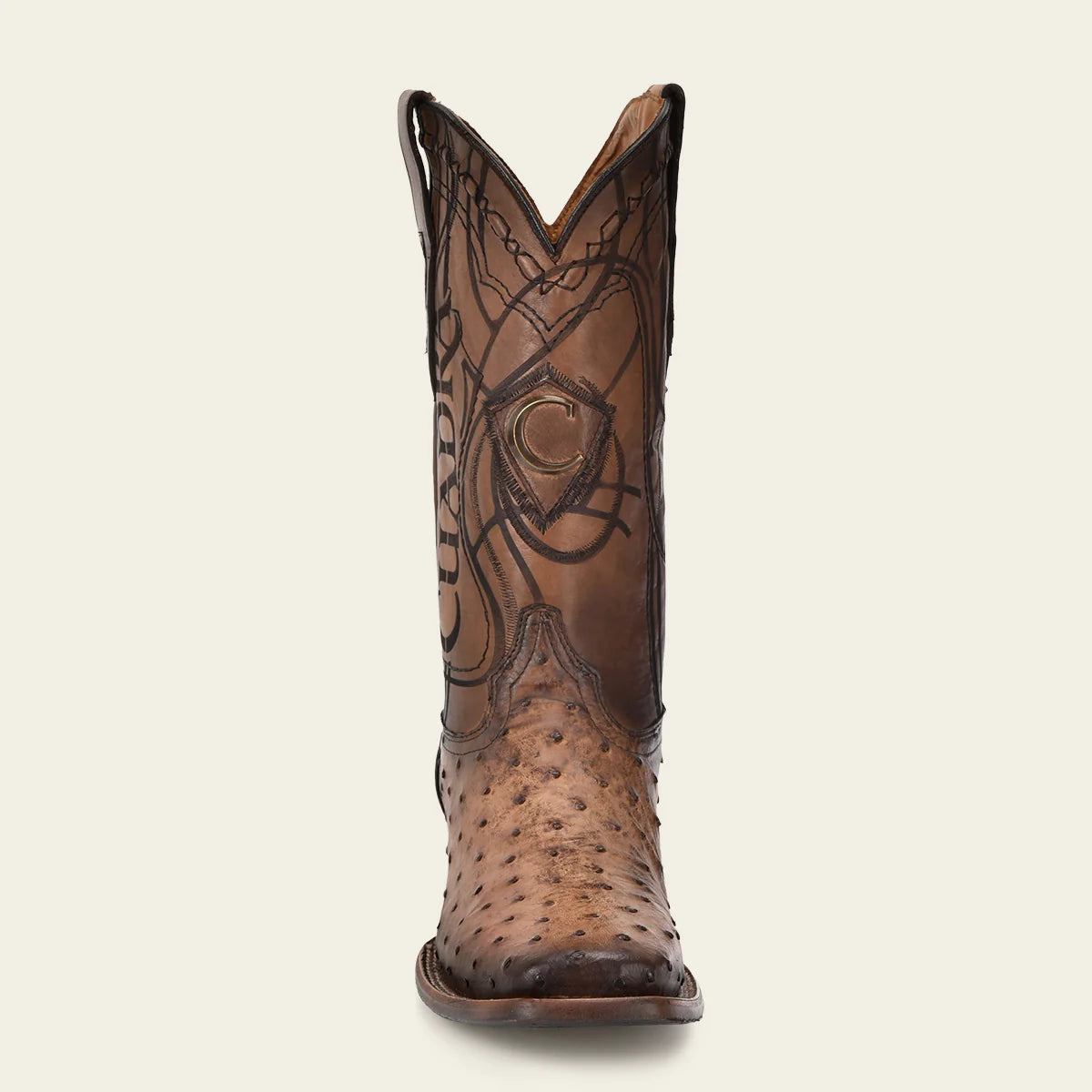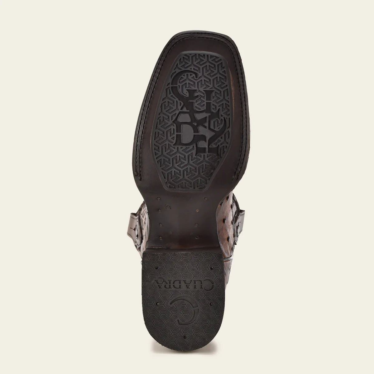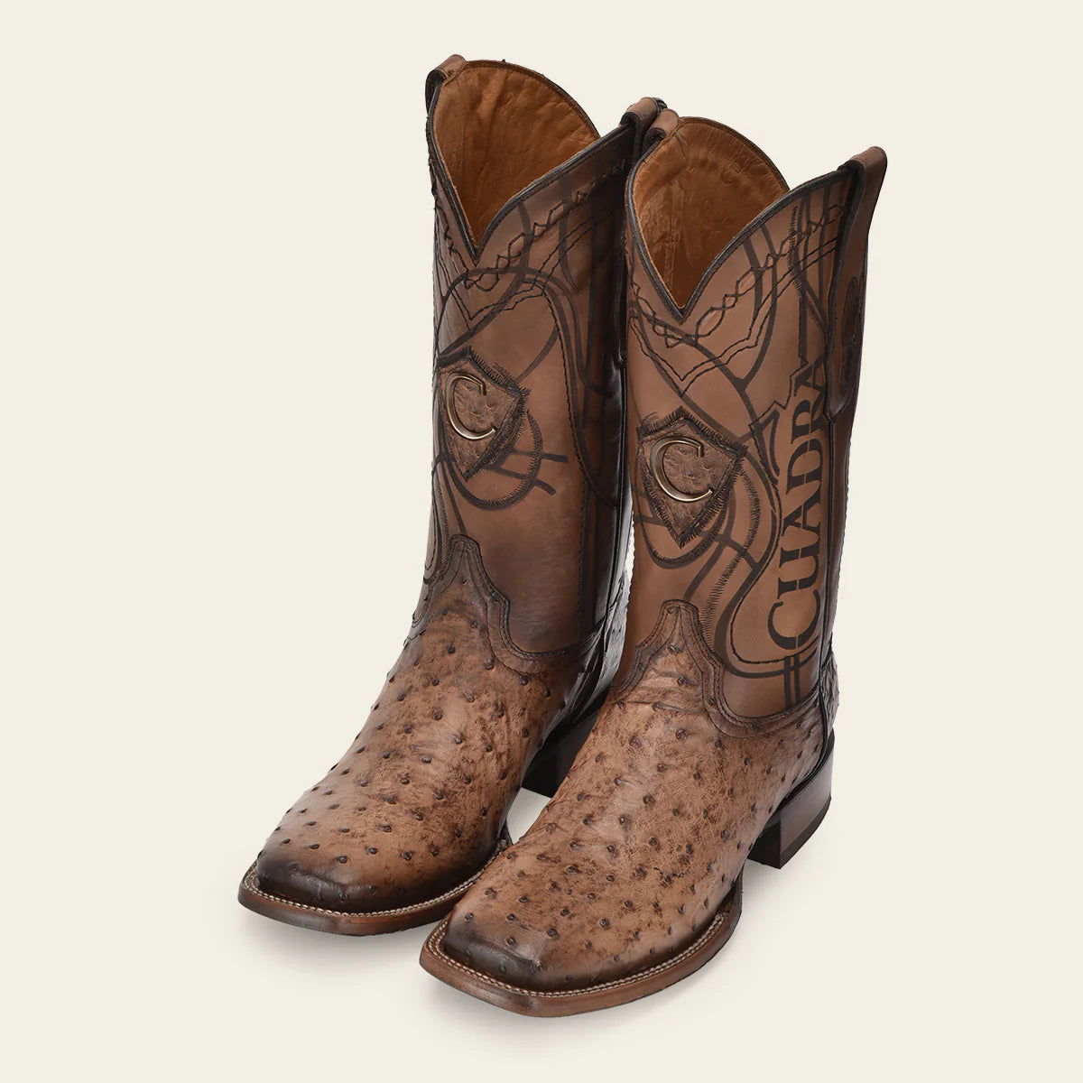 Elevate your style with these exceptional Western engraved brown leather boot for men, meticulously handcrafted from genuine ostrich and bovine leather.